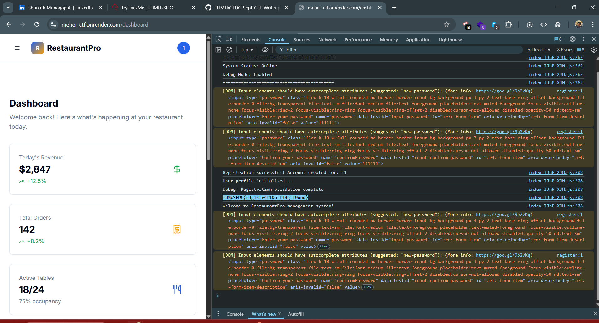 Logged in with the newly created account. Opened the browser developer console (F12) to inspect scripts and logs. And there it was, printed in the console.