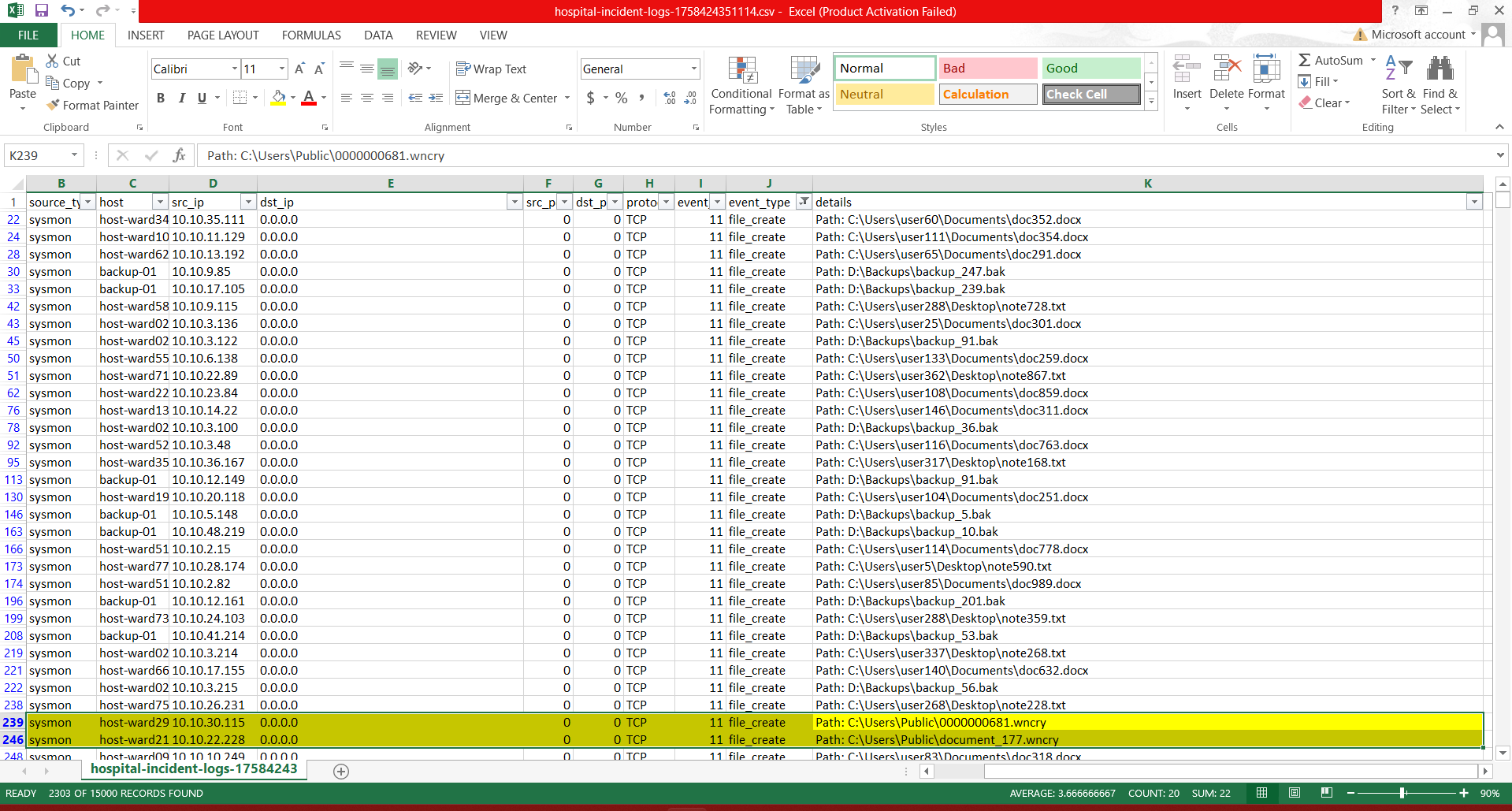 Filtered the event_type column for file_create events. Noticed multiple files being created with the .wncry extension.